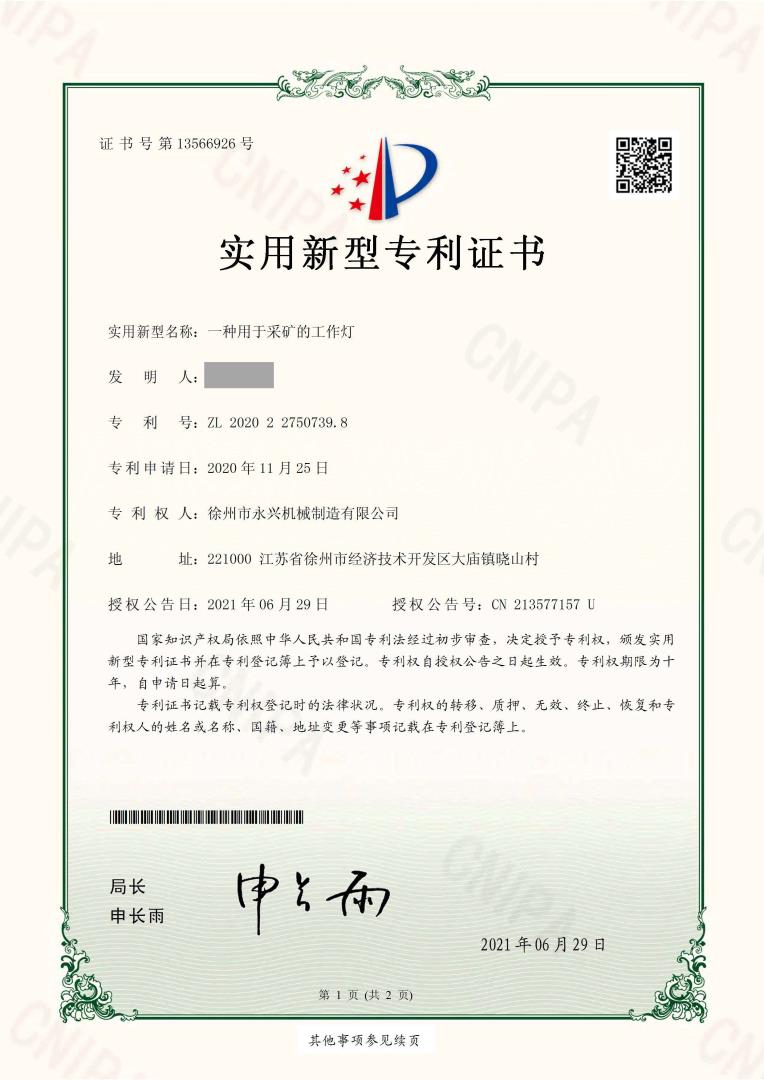 專利證書:一種用于采礦的工作燈
